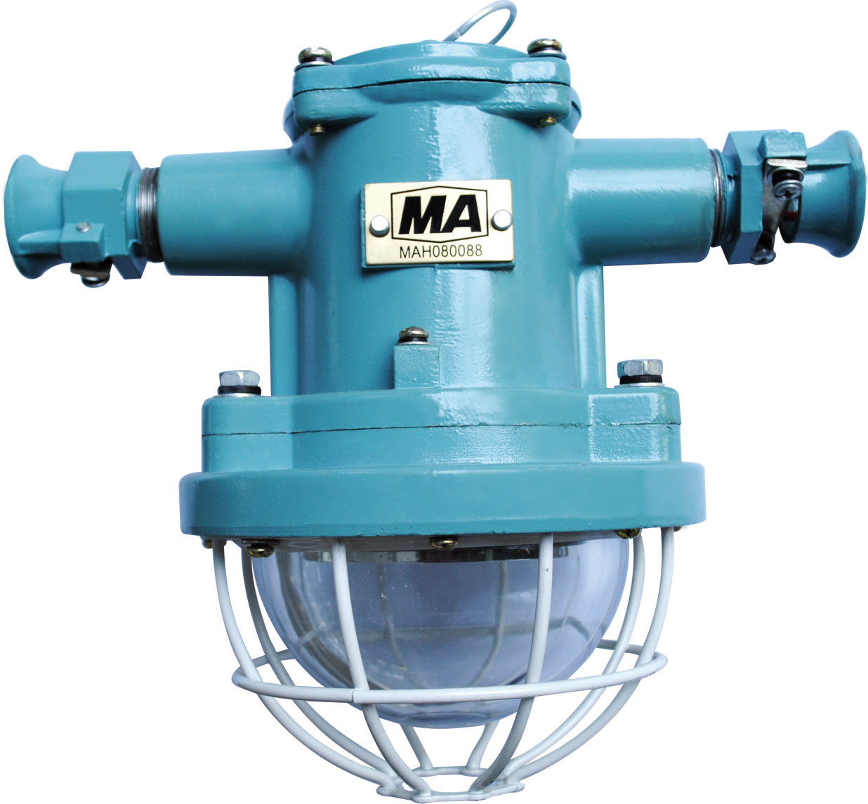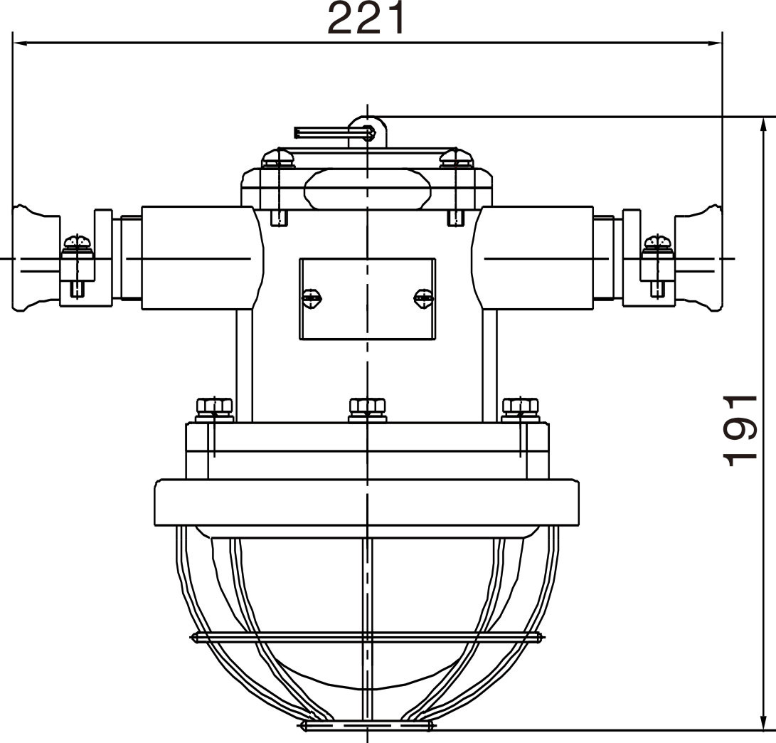LED燈由上蓋、上殼體、下殼體、防爆透明玻璃罩、護罩等組成,上蓋與上殼體用M4螺釘連接,下殼體用M6螺釘與上殼體相連。防爆透明玻璃罩、護罩用M4螺釘固定在下殼體上。上殼體外有M4外接地螺釘、銘牌等。上殼體內有接線板、M4內接地螺釘、LED驅動電源板。下殼體內有密封墊、防爆透明玻璃罩、LED光源、散熱板。散熱板通過上殼體將光源熱量散發到燈體外。上蓋、上殼體、下殼體、防爆透明玻璃罩之間均有符合規定的隔爆接合面隔爆。