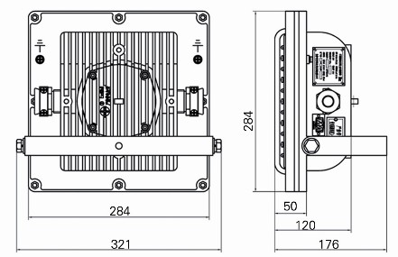 該燈具為固定使用型,采用塵密型兼隔爆結構。主要由接線腔、電源腔、光源防護腔組成。220V交流電源通過引入裝置,接入接線腔,再通過鑲嵌導電柱接入電源板。電源板將220V交流變換成穩壓、恒流、直流電源通過接線柱接入LED光源。光源防護腔由高亮度LED發光二極管、散熱板透明罩、透明罩壓圈等構成。 該燈具配有可調安裝架和4個M8的安裝螺孔,方便用戶安裝燈具和調整照明方向、角度。