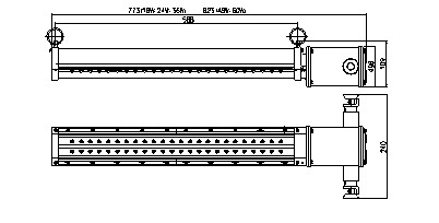 該巷道燈為固定使用型,采用隔爆兼本質安全結構。由接線電源隔爆腔和LED光源腔組成。接線電源隔爆腔內的本安電路,將通過引入裝置的127V交流電,變換為穩壓、恒流、經安全柵雙重保護的本安電源供LED光源使用。LED光源腔,由高亮度LED發光二極管、鰓形散熱外殼體、下殼體、防靜電透明燈罩、端蓋等構成。